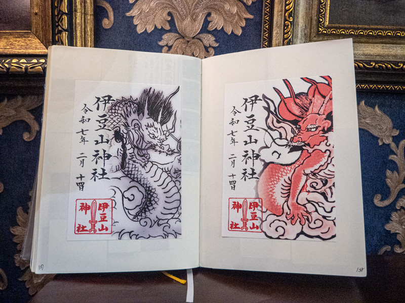 在等待巫女去拿楊柳葉時,我就在授與所看起御朱印。其實在出發前,我有在網路上看過與北條政子與源賴朝相關的御朱印,畫風挺好看的,有點小新動,但這次來現場沒看到我喜歡的那張,加上我本來對源賴朝這個人沒有特別好感,也就沒那麼積極想收集。倒是當我在社務所看到以紅白雙龍為主題的御朱印時,整個人瞬間被震撼到,筆觸飽滿有力,日本畫師在描繪龍的氣勢時真的毫不含糊,那種霸氣與靈氣兼具的感覺,讓我忍不住又掏錢打包帶走。
