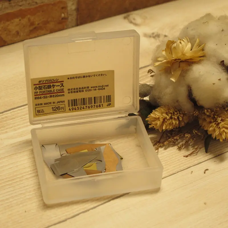 官方給的錫盒雖然不錯,只是打開需要用旋轉的方式,不適合單手打開,尤其在外頭時要用,有時真的不是兩手都能空下來,後來我只要出門要帶,就會用無印良品的小肥皂盒裝著,小肥皂盒尺寸不大,可單手開關,十分方便。