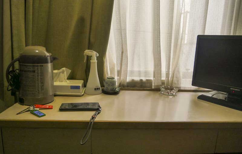 再往前就是超大的桌子,有大桌子也讓我很開心,畢竟我有很多資料要整理,晚上也需要檢視隔天的行程。桌上備有煮水壺、茶包和證明這間是吸菸房的菸灰缸,還有電視、跟一些說明書,書桌下面是冰箱,這個冰箱很特別,只要打開門就能直接拉出整個籃子,坐著也能輕鬆拿到飲料,不需要蹲下翻找,這冰箱拉籃設計我很喜歡。