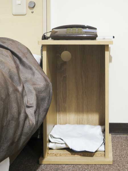 床旁邊有著小櫃子,上方有插座跟小燈,櫃子下面則是有放置睡衣,只是床頭櫃位置在房間被切掉的角落,導致過來這邊的路線很卡,所以我是要退房時才發現的。