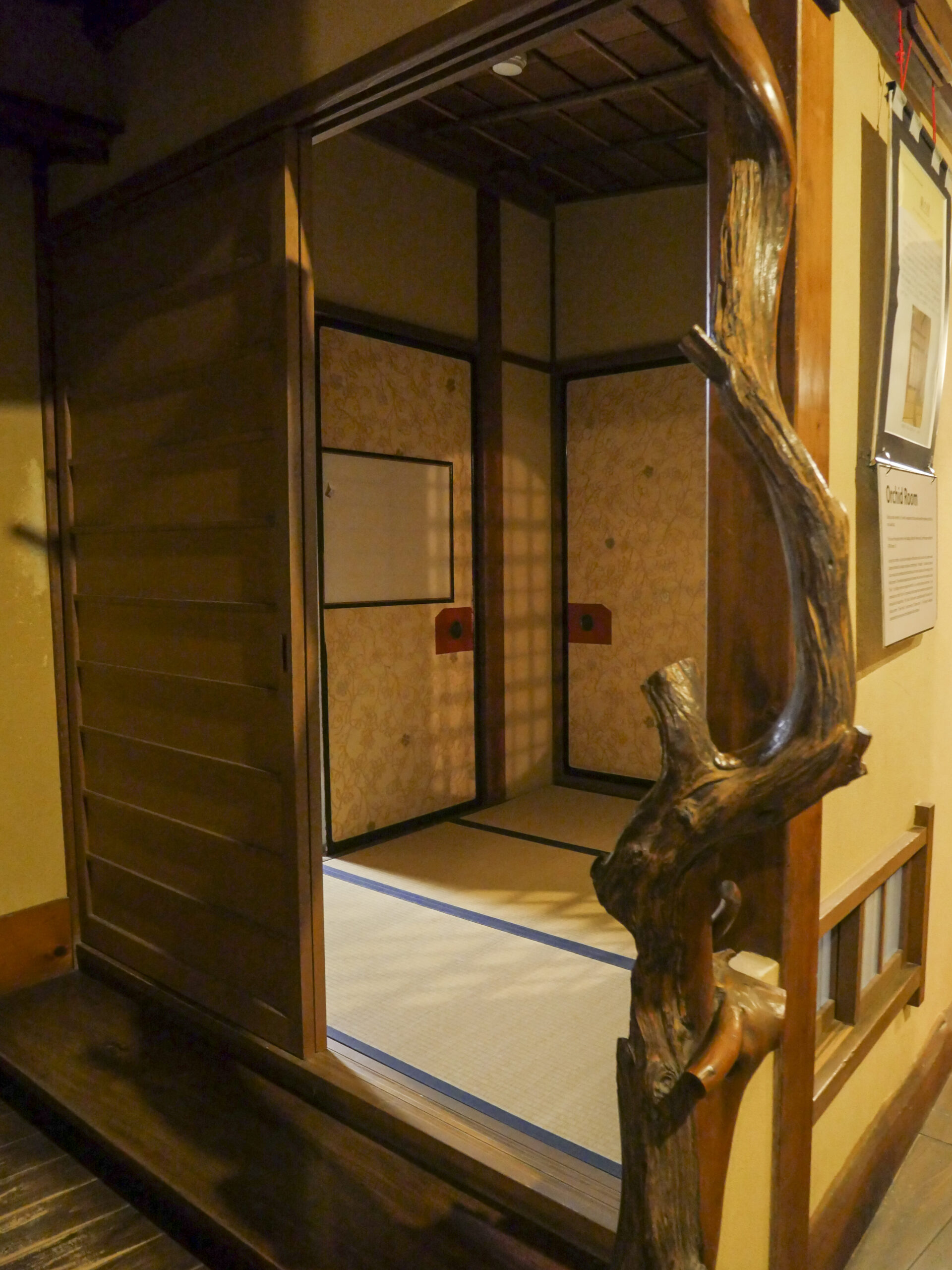 夜間參觀時,昏黃的燈光勾勒出木造建築的線條,整座館內瀰漫著一種介於懷舊與靜謐之間的氛圍。不過,也正因為是晚上,加上遊客人數不多,走到後段時,氣氛會逐漸從原本的大正浪漫,轉為略帶壓迫感的安靜。那一刻我第一次真切體會到,「館場太大、人太少」反而會讓人有些不安,也更加確信這類型的空間,白天或有人氣時來訪,會更能安心地欣賞細節。