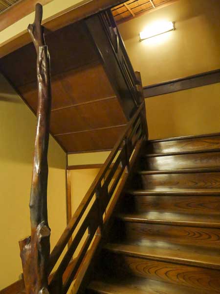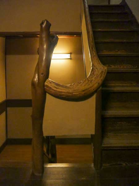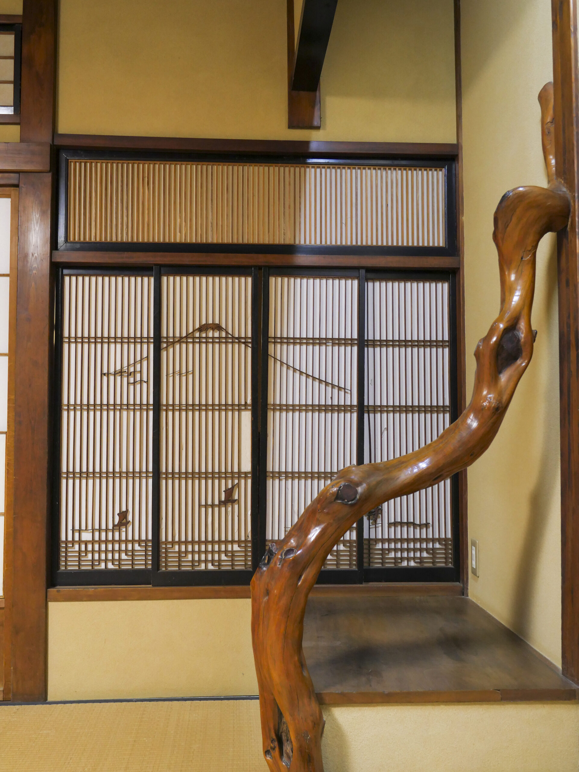 在客房樓層行走,每一處柱樑、樓梯扶手與窗櫺雕花的接合,都流露出匠人細膩的手工與對木材選用的極致講究。最引人入勝的,莫過於當年三位頂尖建築職人同場競賽的巧思,三人為了在華麗感與獨特性上一較高下,各樓層大量運用了精巧的組子細工(完全不使用釘子的木雕窗花),並在細節處展現不同的藝術風格。