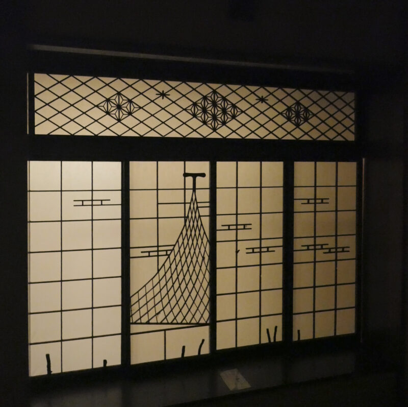 二樓如前所述,保留了大量過去溫泉旅館的客房空間,讓展示內容與實際歷史情境自然交織在一起。東海館的內部結構相當豐富,二樓完整保留了榻榻米格局與日本書院造風格,傳統拉門、細緻的木紋地板與透光紙窗,共同構成昭和初期溫泉旅館的生活樣貌。這樣的房間配置,其實與我入住的 K’s House 伊東溫泉傳統旅館有幾分相似,皆沿襲傳統日式客房「屋簷式」的構造形式。木板走廊位於中央,兩側分布著一間間客房,並在走廊牆面設置各種形狀與樣式的雕刻裝飾窗,使整體視覺層次豐富,也讓人在移動時不斷有新的細節可以停下來觀看。