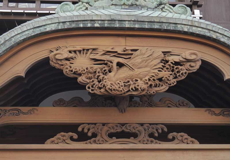 走進東海館的大門,首先映入眼簾的是入口上方精美木雕與唐破風造型的玄關,這些雕刻反映了當時工匠的技藝。