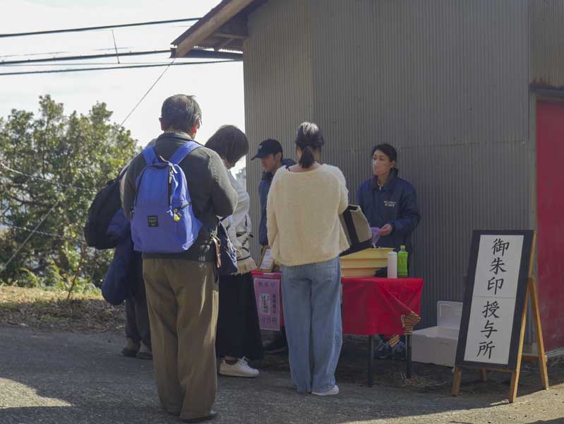 好不容易爬坡上來,在第一個轉彎處就看到神社人員設立的小攤位,販售當日限定的御朱印、和菓子與明信片等相關紀念品。我原以為參觀雛壇需要購票入場,便先過去看看,才發現門票費用是自己投到會場旁的奉納箱即可。