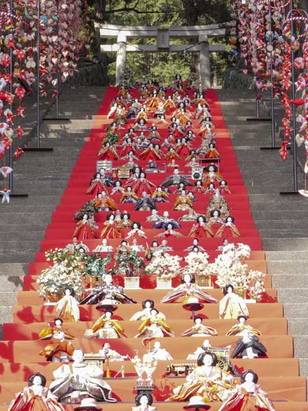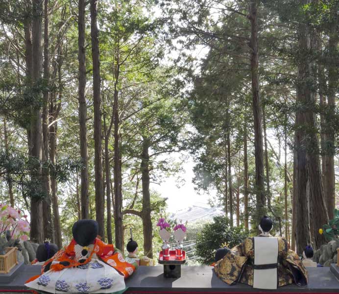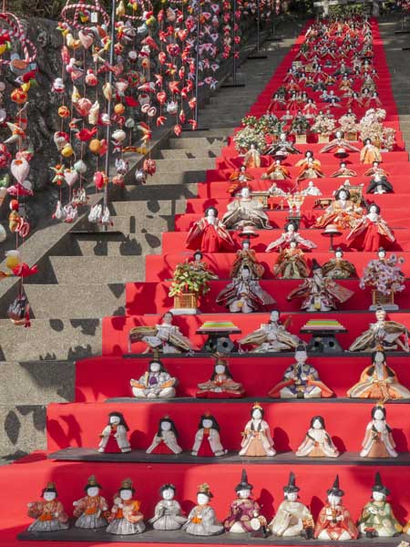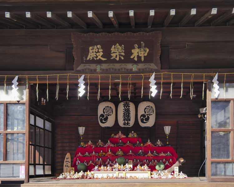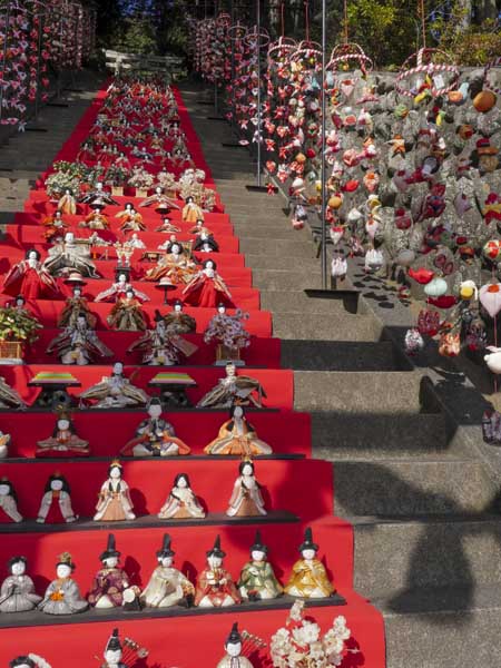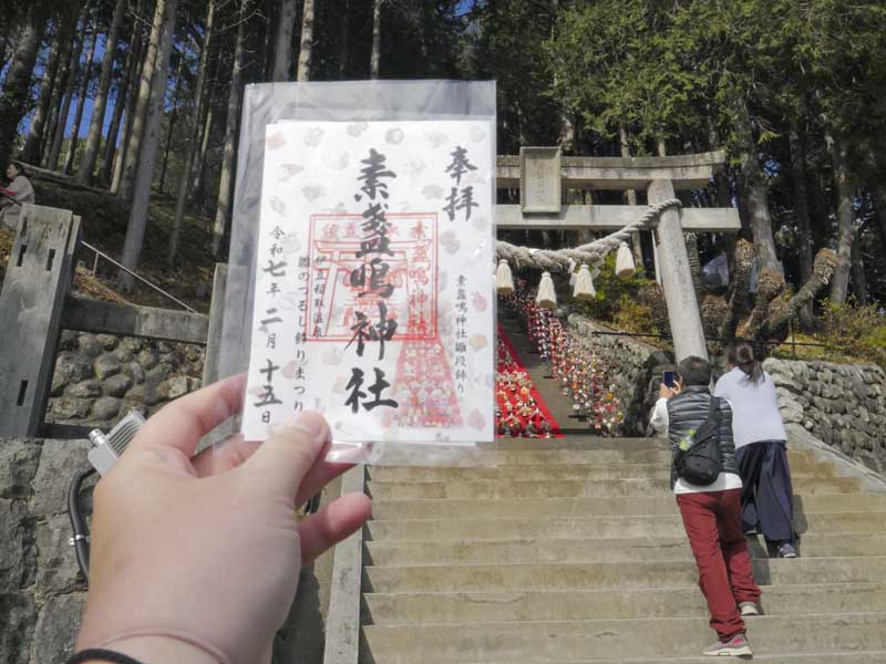 素盞鳴神社的戶外雛壇,被譽為日本最長的戶外雛壇,總計約有 118 階石梯。每年女兒節前後的限定期間,這座階梯會化身為壯觀的雛壇舞台,層層展示著華美的雛人偶與手工吊飾。這些人偶每日由工作人員親手擺設。清晨出動,午後三點左右就得收回,若遇雨天則會暫停展示,如此繁複的日常作業,也讓這場女兒節活動充滿儀式感與生命力。