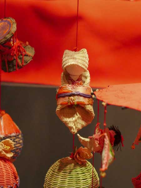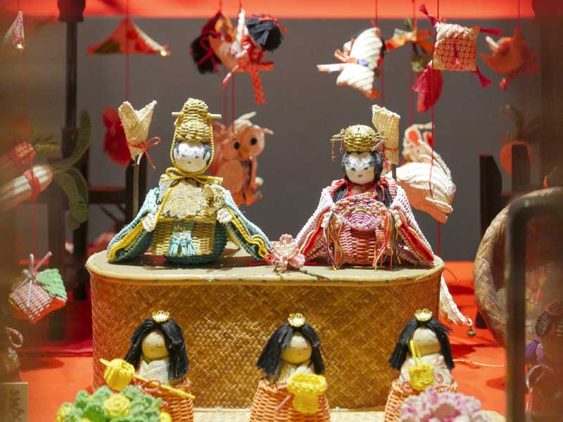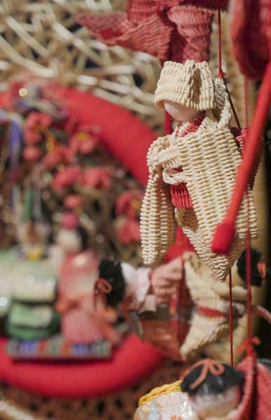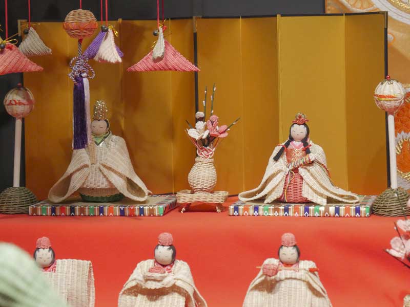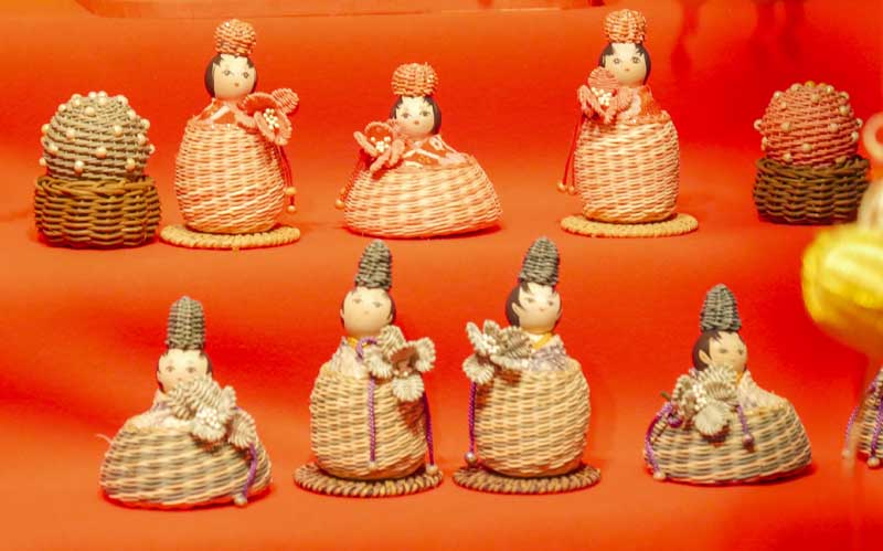 眼前的景象讓我瞬間為之驚艷,這裡展示的雛人形與雛吊飾,居然是以竹材編製而成。雖然雛人形嘗試不同材質並非罕見,但連吊飾也以竹為主要素材,應該也不是常見,至少我之前沒事在日本樂天搜尋過雛人形,搜尋到樣式主要材質是桐木(木目込み)、塑像+布衣、陶製、和紙、縮緬布料(つるし飾り)等製作,竹編這是我第一次看到,我必須說我一眼就愛上了。