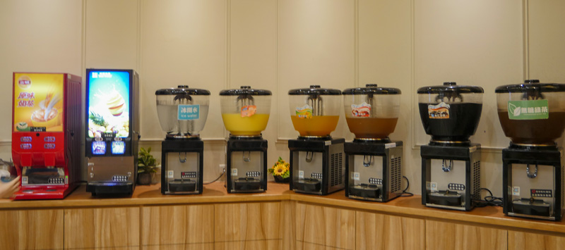 飲料吧採自助取用,熱飲種類固定,如咖啡、奶茶、拿鐵之類的,大圓桶的冷飲每次來多少都有變化,只有無糖綠茶與白開水是會固定,白開水固定挺好的,因為這邊沒有提供洗杯子的空間,若是喝太多種飲料,還能用白開水稍微過下杯子,好讓杯子的位置不至於太複雜。我也會視飲料品項來做混調,像是最經典就是用芭樂汁去跟綠茶混調,做成芭樂綠茶也挺好喝。