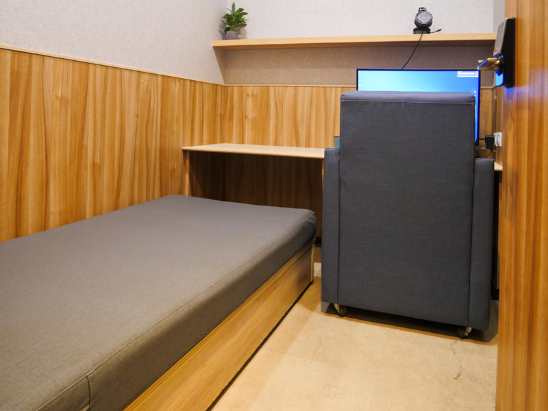 進度包廂後,第一感受是這空間並不壓迫,大概就跟我在日本南千住住的單人雅房差不多,只是少掉一堆有的沒有的東西,就顯得這空間挺寬敞的。整個空間配置也簡單,就電腦桌與床。