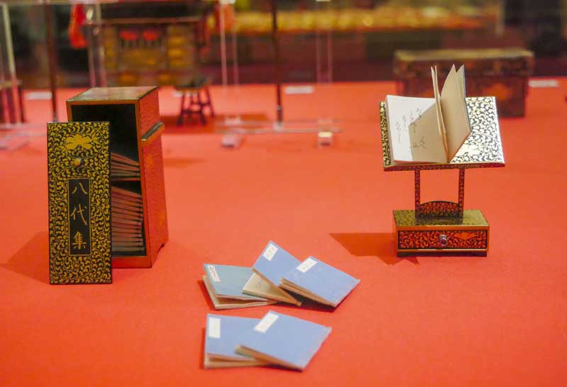 在部分展示中,也能看到與文化修養相關的器物,例如和歌集《八代集》的縮本與書見台,象徵武家女性所需具備的文學教養。在江戶時代,大名家女性雖然身處武家社會,但仍深受宮廷文化影響,學習和歌、書道與禮儀被視為重要修養,這些文學器物被納入雛壇之中,意味著女性的教育不僅關乎家庭角色,也與文化傳承密切相關。透過這些象徵性的物件,姬君在觀看與理解之中逐漸認識自身未來將扮演的社會角色,使婚姻不只是個人事件,而是一種制度與身份的轉換。