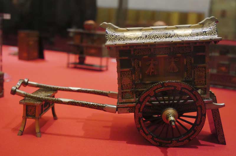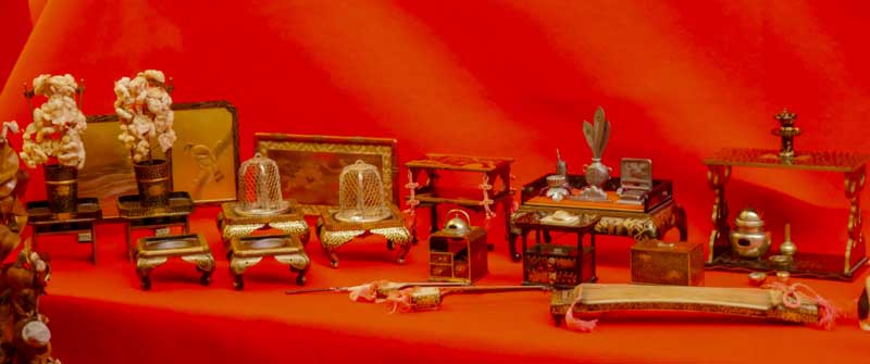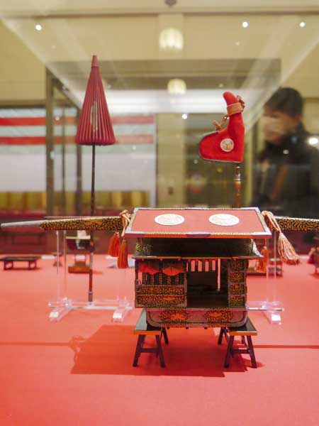 展場中可以看到各式細緻的雛道具,例如轎子、衣架、收納櫃、書見台、鏡台以及各類飲食與宴席器物,這些器物多以木材製作,再以蒔繪、金箔與螺鈿技術裝飾,其精細程度往往與實際婚禮器物相同,即使尺寸縮小至人形比例,其漆面光澤、金粉紋樣與構造比例仍維持高度工藝水準。