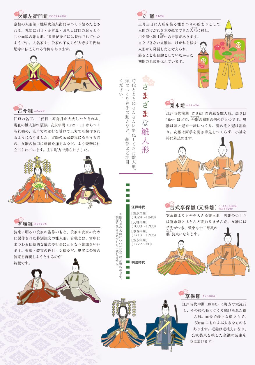 隨著此一轉變逐步深化,雛人形不再僅停留於象徵性的儀式物件,而開始在造型、材質與表現形式上持續演化,並在不同時代與階層之中發展出多樣的樣式。為了更清楚理解這一演變脈絡,此處可此處可參考京都國立博物館於2022年特展導覽手冊中的說明,該資料對雛人形的發展脈絡做出了相當清晰的整理。整體而言,其演變順序應為:立雛 ( 最早的原型 )⮕ 寬永雛 (17 世紀前期)⮕ 古式享保雛 ( 元祿雛,17 世紀末~18 世紀初)⮕ 享保雛 (18 世紀中期)⮕ 次郎左衛門雛 (18 世紀後半)⮕ 古今雛 (18 世紀後半~)