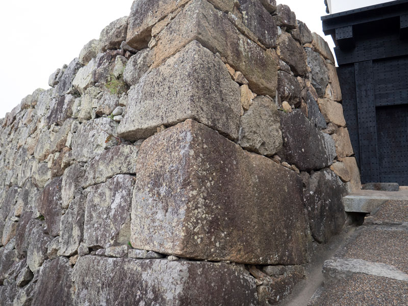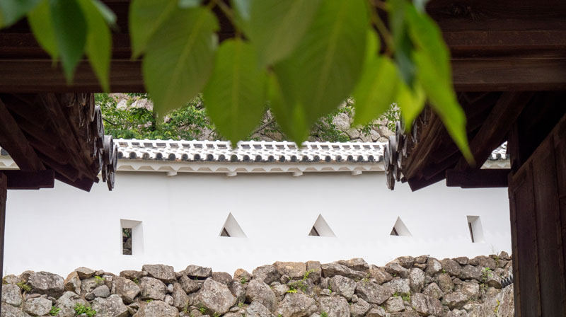 一路上往天守閣前進時,最吸引我注意的就是城牆上的方形、三角形的開口,我知道這是射擊孔 ( 鉄砲狭間 ),但是很少看到這麼多種形狀,記憶中看到的都是單一造型,難得看到混合的,後來一查才知道不同形狀,是對應不同武器,方形狹間 ( 四角形開口 )主 要是給火繩銃射擊,讓射手在水平左右方向有更多活動空間,適合掃射或應付橫向移動的敵人;三角形狹間,則主要是讓弓箭射擊,方便上下調整射擊方向。每一個射擊孔都是高低交錯的配置,主要是方便不同位置的守軍在各自射擊高度發揮作用,減少死角,也避免射擊角度過於單一,讓入侵者抓出躲避的角度。