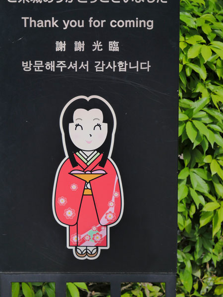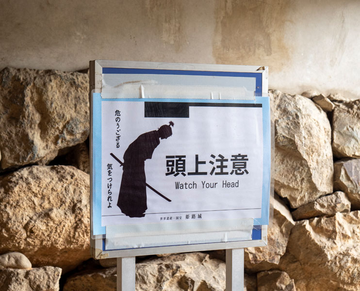貼心的是,城內各處都能看到提醒遊客「小心頭部」的標語,有的地方甚至在低矮的橫樑上包上緩衝材 ( 如上圖 ),就算不小心撞上去,也不至於太慘烈,畢竟在城內受傷,救護人員要上來救人也麻煩。像這塊告示牌更是別出心裁,剪影裡的武士正低頭避過門框,還配上古風的文字,讓嚴肅的安全提示多了幾分幽默感。