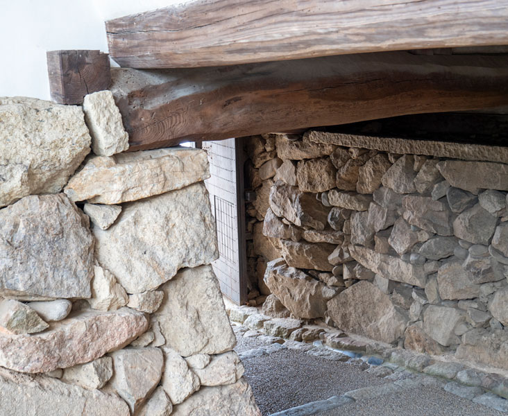 像這個石落し(いしおとし)也是其中之一,翻成中文就是所謂的投石孔。戰時可從上方向下投擲石頭、熱水、火焰、箭矢等,用來阻止攻城敵人靠近牆基,想像下電視劇裡演的城池保衛戰,大體上差不多。不過不同的是,日本這邊是平時封閉,只有戰時才會打開進行防禦,也是城堡重要的守備設計。