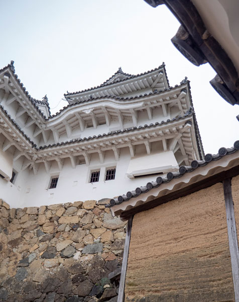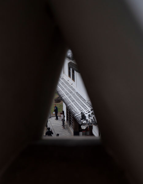 這天運氣不錯,進入天守閣時完全不用排隊,沿途可以盡情走走停停,不必擔心擋到他人,更好的從不同角度欣賞大小天守、渡櫓、多重門櫓相互連結所構築出的層層美感,這是必須親自深入其間才能體會的。人潮最集中的地方,果然還是在天守閣內,許多人在高處觀景,俯瞰城堡與姬路市街,天守閣內而最令我震撼的,莫過於那些為戰鬥與防禦而設的細節-武器架、投石口、暗室、射擊平台等,這些在重建後的天守閣裡是看不到的,這些設計提醒著參觀者,姬路城潔白優雅的外表下,其實隱藏著冷冽的戰爭本質,姬路城再美,也是為戰爭而誕生。慶幸的是,今天我們能生活在和平時代,讓它只需展現最美的一面,而我們可以用詩歌文學來歌頌它。