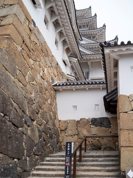 我本來以為會很快就抵達天守閣,畢竟以往參觀其他城堡都是如此,就算彎彎繞繞也只會多花一點時間,但姬路城完全不是這樣。從菱之門往天守閣這一路走來,不僅要沿著高聳的石垣爬坡,還得踩上層層石階。實際走起來,其實相當耗體力,尤其對像我這種平時沒特別運動的人來說,真的有小點小累,,走走停停恐怕就得耗掉半小時。好在姬路城很貼心,在接近大天守入口前的路段還是設有一些休息座椅,建議有就先坐著休息下,畢竟座椅跟座椅間的距離都頗長的說。