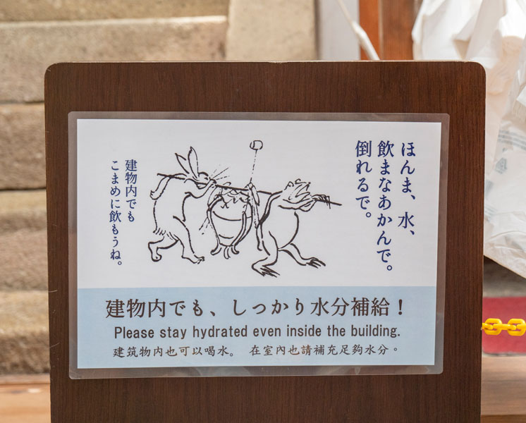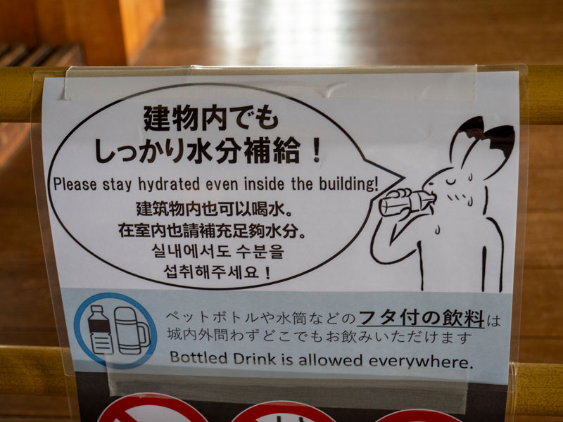 另一個讓我記憶深刻的有趣巧思,就是水分補給的指示牌,由於天守閣內沒有冷氣,外加天守閣本身就比較大,一圈走下來起碼半小時跑不掉,充足的水分攝取真的很重要,只是沒想到他們會以日本國寶級繪卷《鳥獸戲画》來繪製,瞬間讓嚴肅的歷史空間多了幾分輕鬆感,還附帶多國語言提醒遊客,即使在建築內也要適時補充水分,並且貼心說明可攜帶有瓶蓋的飲品入內,讓人在沉浸於天守閣歷史氛圍的同時,也感受到現代管理者對遊客體驗的細緻考量。