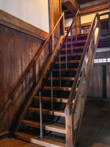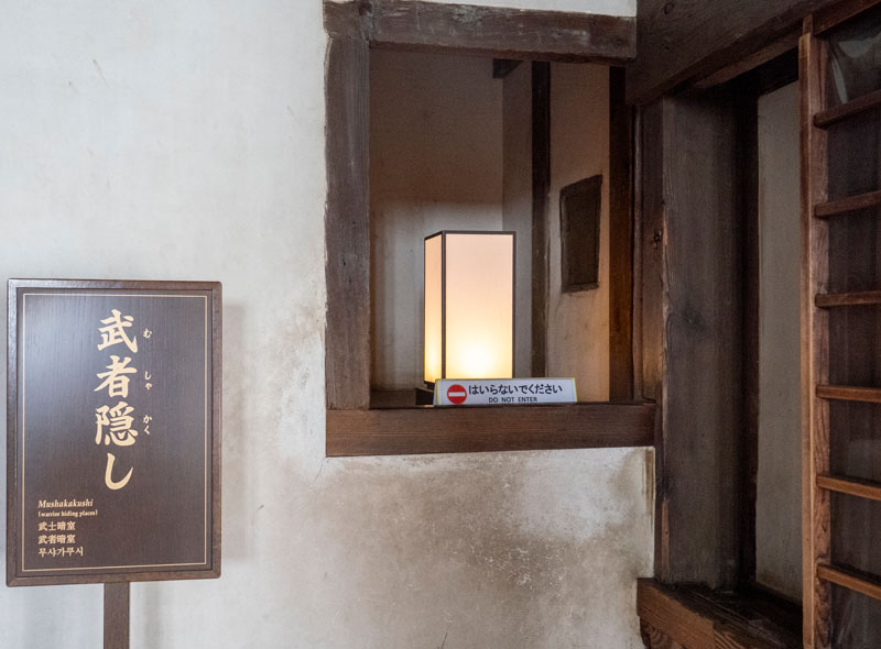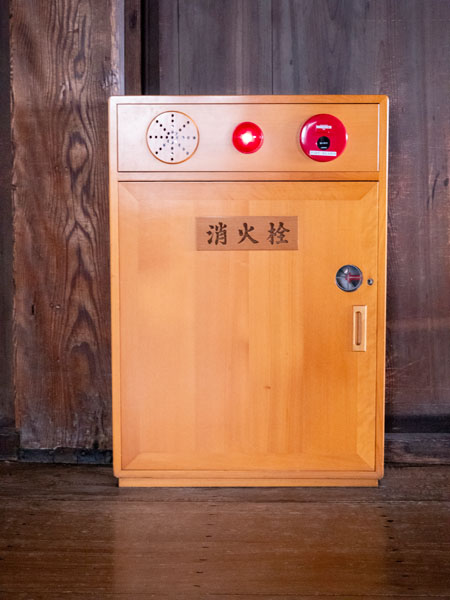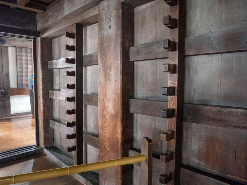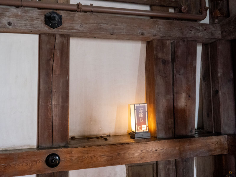 走在天守閣內,除了那些充滿戰國氣息的防禦設計,還能捕捉到一些讓人有趣的小細節,比如消防箱。它沒有一般消防設備那種鮮紅的塑膠外殼,而是特地換上了木色包覆,與四周溫潤的木牆面與地板很接近,我想以日本人能的能力,應該可以讓兩邊顏色差距更小,好讓乍看之下甚至會誤以為是天守閣的一部分,只是這樣一來,在緊急時候可能就會耽誤到對天守閣不熟的人員對其火災搶救,有時候太像也不一定是件好事。