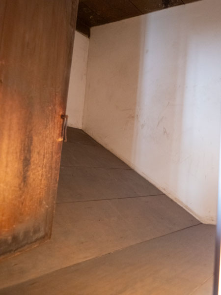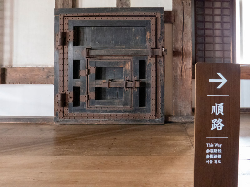當時看到這到門時,第一反應就是這好像電影裡被打劫的銀行保險箱大門,看資訊才知道這雙重門,常見於日本天守,保衛天守閣內的重要通道,每個出入口均有內側和外側門來進行二重防禦,以提供天守閣內的安全性與防火性,同時在進行防禦時也能延緩敵軍推進的速度,為己方爭取時間。