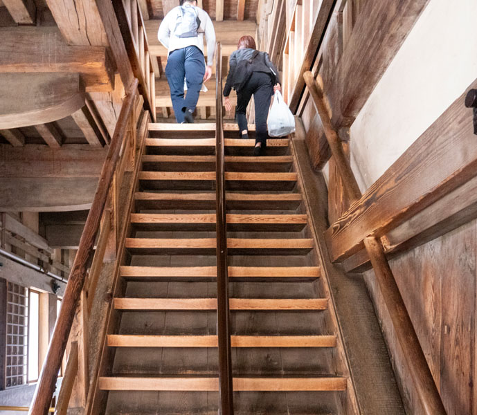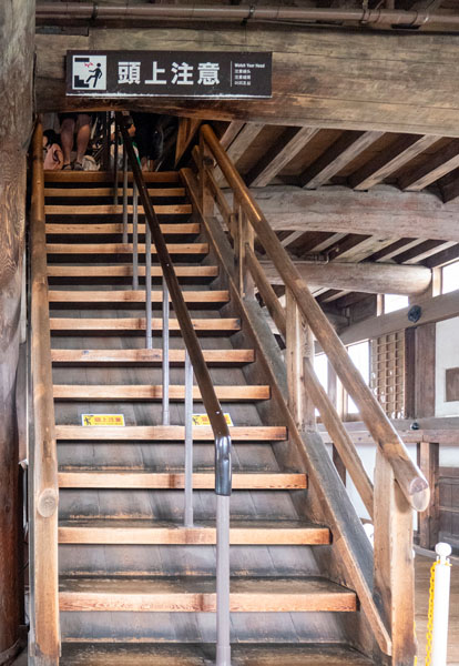 比較出乎我意料的是,姬路城天守閣的樓梯並沒有想像中那麼陡峭。原本以為會像滋賀的彥根城一樣,覺得應該有 75 度陡的樓梯,甚至有一段還得靠繩子當輔助才能爬上去,\那次之後,我就不覺得台南老宅的樓梯有多難走了。雖然姬路城的樓梯對比其他古城來說算是相對平緩,但與現代日常生活中使用的樓梯相比,仍然偏陡,這讓下樓危險性增加,加上木質材質容易打滑,為了避免遊客踩空滑倒,每個踏板上都鋪有止滑墊,並且還設有扶手,高個子容易撞到的地方也安排警告標語,可以看見管理單位在盡可能的以不傷礙古蹟為前提的保護遊客安全。
