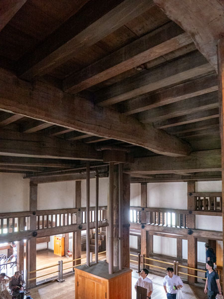 姬路城最為人津津樂道的特色之一,便是其內部的「中心大柱」。城內共有東、西兩根巨大的檜木心柱,從地下室一路貫穿至五樓天守。東大柱為一整根高達 25 公尺的原木,而西大柱則為兩段長木精巧銜接而成,畢竟如此巨大且規格一致的木材並非易得,若找不到兩根高度相近的原木,也只能透過傳統榫卯工法將木材接合,打造出一根與之匹配的中心大柱。