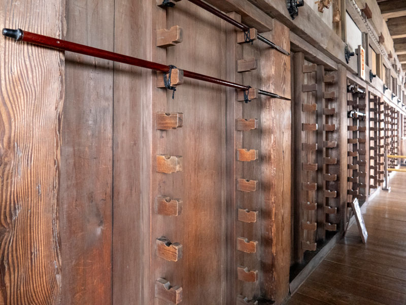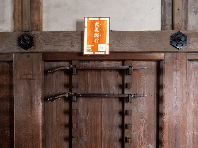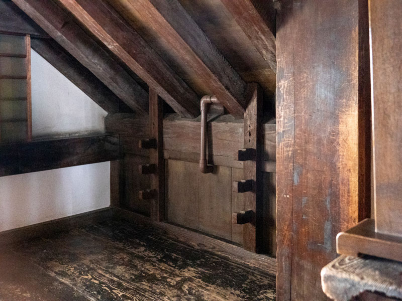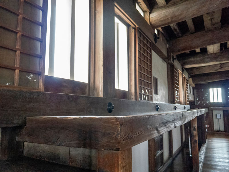 走到四樓時,注意到牆邊有個木製平台,這平台在戰時的射擊平台,火繩槍、弓箭等武器會就近擺放在旁邊的武具掛け上,守軍只要一步跨到平台上進行攻擊與監視。在天守閣內這種為攻擊而設計的東西不少,有些看起來還好的一角落,可能在戰時都是兇殘的攻擊位置。