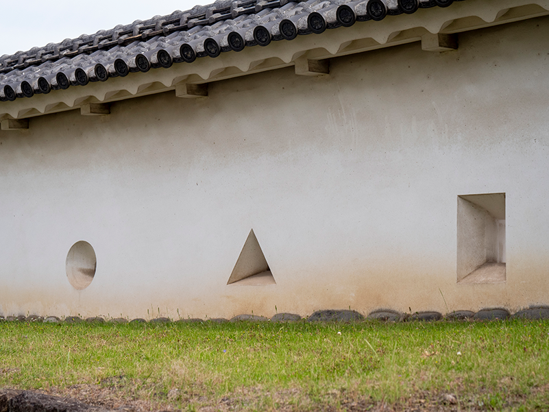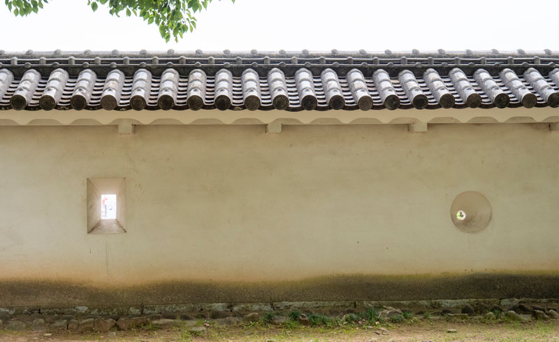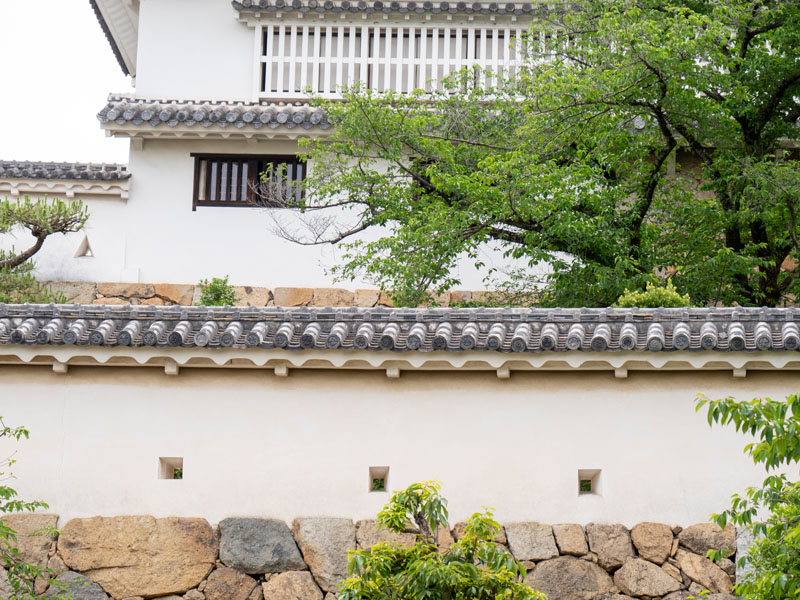 一般的土塀,是日本傳統城堡、武家宅邸、寺院常見的防禦與分隔牆,內部以木架為骨,夯實泥土、砂與稻草混合而成,外層再均勻塗抹白漆喰,不僅美觀,還有防水、防火的作用。姬路城的土塀與石垣、門櫓共同形成縝密的曲折防禦線,平時用來分隔曲輪、倉庫與居住區,戰時則能導引敵人動線、爭取守軍反擊時間。牆上還開有狹間,方便弓矢或火繩銃射擊。