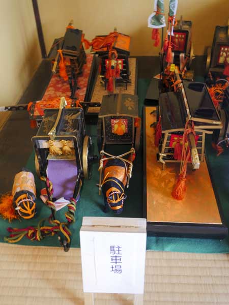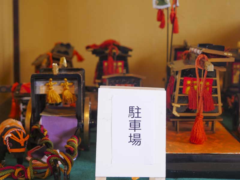 最讓我印象深刻的是那些被集中擺放的御所車與轎子,彷彿變成了一座停車場。傳統上象徵貴族出行的御所車,在這裡重新詮釋為現代交通工具,所以就有了專用的停放區,這種帶著現代邏輯的重新安排,既合理又幽默,也正是福よせ雛最迷人的地方,傳統概念替換成現代模式,讓人不禁為他們的轉念感到驚嘆。