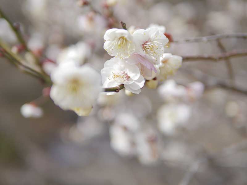相比之下,梅花的姿態則內斂許多。它沒有櫻花的繁花簇擁,卻多了一份疏影橫斜的骨幹美,拍攝梅花時,必須貼近觀察其枝幹的轉折與花瓣的質感,在方寸之間尋找留白,才能拍出梅花的美,不像櫻花那樣遠拍也有遠拍的美。有趣的是,古人云「焉得梅花撲鼻香」,但實際到現場後才發現,梅花的香氣淡到基本上聞不太到,似乎要非常貼近梅花屏息近觀,才能補捉那若有似無的清冷芬芳,或許梅花會吸引古代文人墨客的喜歡,可能就是這種需要近距離才能體會的冷靜與孤傲。