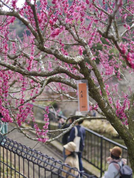 如今的熱海梅園共栽種了近60個品種、超過470株梅樹,涵蓋早咲、中咲與遲咲三個花期,從每年一月中旬一路盛開至三月上旬,是全日本開花最早,花期也相對最長的梅園之一,梅園也非常用心,知道品種很多,所以每一株梅花樹下都掛有該梅樹品種的牌子,賞梅同時也來認識梅樹品種。