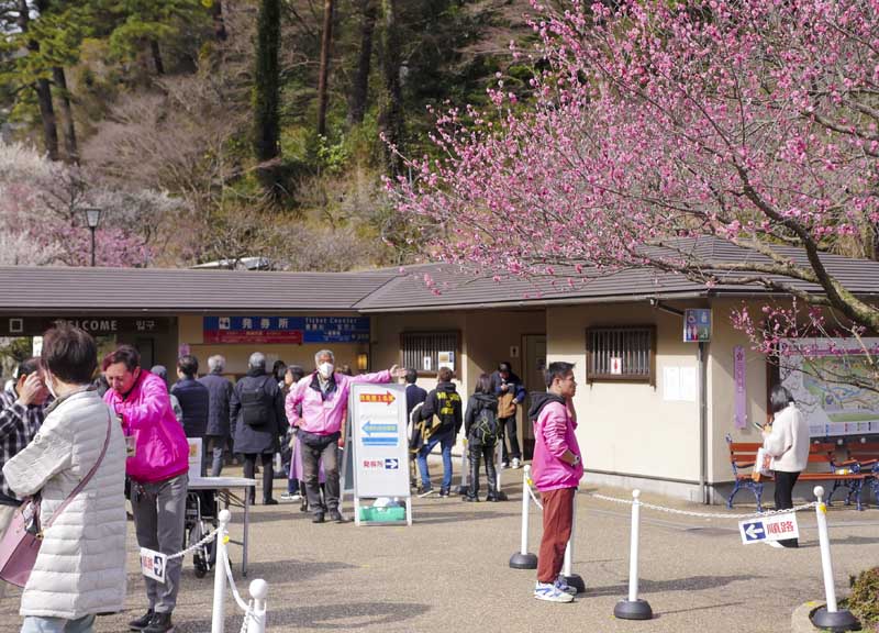熱海梅園全年開放,但只有在梅花祭期間 ( 大約每年 1 月中旬~3 月上旬 ) 才會收取門票費用,其他季節是免費入園參觀的。值得一提的是,熱海市內的部分飯店與梅園有合作,在梅花祭期間是可免費入園。我雖然沒住熱海的飯店,但對於再熱海住宿的人來說也是一項很實在的優惠旅客。印象深刻的是,當天在售票口迎接遊客的工作人員們,無論年齡或性別,全都穿著與入口處梅花色相互應的同色系外套,不禁感嘆這就是日本阿~