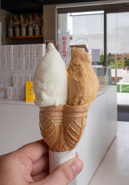 後來回台灣要寫這篇文章一查才知道,能登ミルク 本店的營業對當地的重要,因為他們家堅持使用能登半島生乳,不混入其他地方的牛乳。在 2024 年初地震重創能登半島,導致運送原物料的路中斷,他們能恢復營業,代表著部份能登交通的路線是可以,酪農繼續生產,是「能登仍然活著的證明。」。
