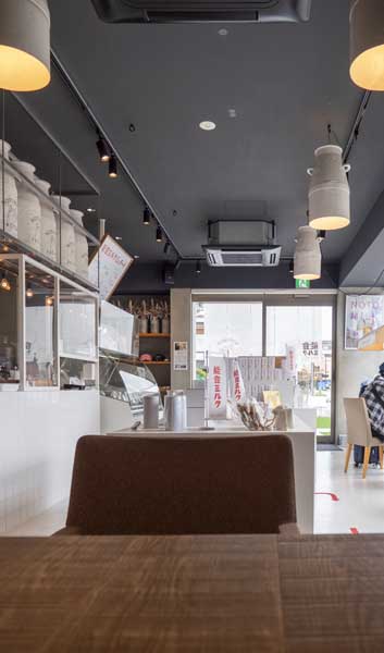 能登ミルク本店的內部空間以白色為主基調,搭配木質桌面,整體氛圍非常的舒服,位置有適合多人一起享用的四人座位區,也有適合一個人獨享的靠著玻璃窗的吧檯椅區。