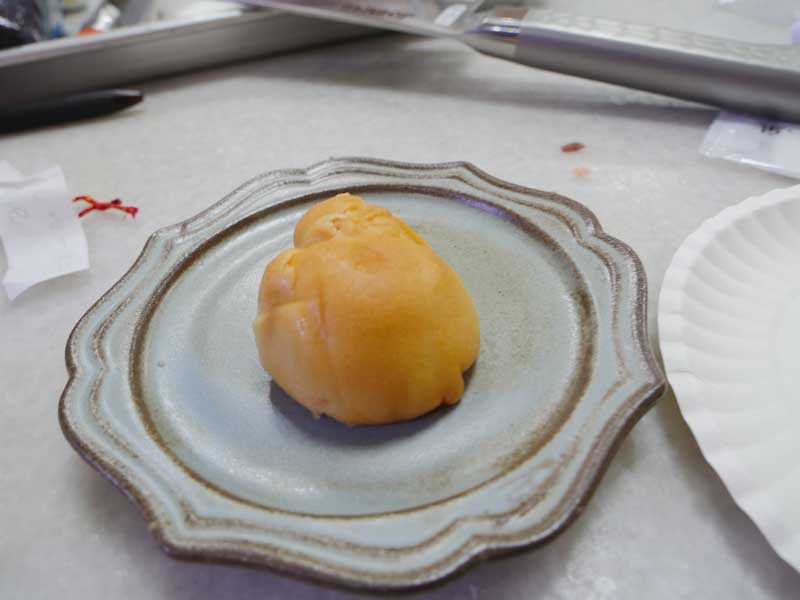 另一款外型近似小鳥的燒菓子,形式上有點接近日本傳統饅頭,只是改用烤製完成,剛好跟我們這次在東京製菓學校學的牛奶饅頭算是接近的品項。這款真正厲害的地方在於內餡,前一款粉色+嫩綠色的和菓子,應該是用色素去調色,避免櫻花風味與其他材料產生味道上的衝突,我之前就用過櫻花粉去做,至今依舊是我的噩夢之一,這一款則是直接在內餡中處理櫻花元素,卻完全沒有踩雷。內餡質地滑順,櫻花香氣被調和得非常漂亮,不搶味、不突兀,是我第一次吃到真的好吃的櫻花系甜點。
